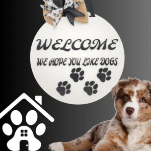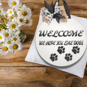 Welcome guests with a touch of personality! This 18″ round door hanger is perfect for dog lovers, featuring the playful message: “Welcome, We Hope You Like Dogs.” Each piece is handcrafted with care, made from high-quality wood and designed to last.