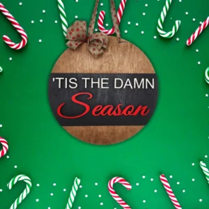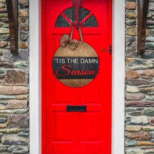 Welcome the holiday spirit with a touch of sass and style! Our “Tis The Damn Season” front door welcome sign is the perfect way to greet your guests with a festive, cheeky flair. This beautiful round wooden sign is 18″ round suitable for any door or entryway.