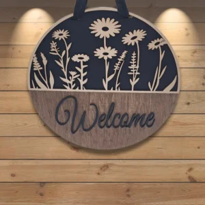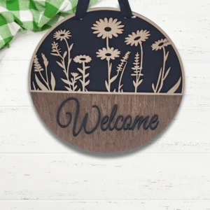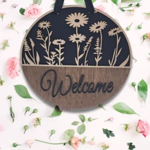 Make your home feel warm and inviting with this stunning “Welcome” front door sign. Designed with a sleek black background and elegant wood tones, this sign exudes modern farmhouse charm. The top is adorned with a beautifully crafted garden of daisies, adding a touch of natural beauty to your entryway.